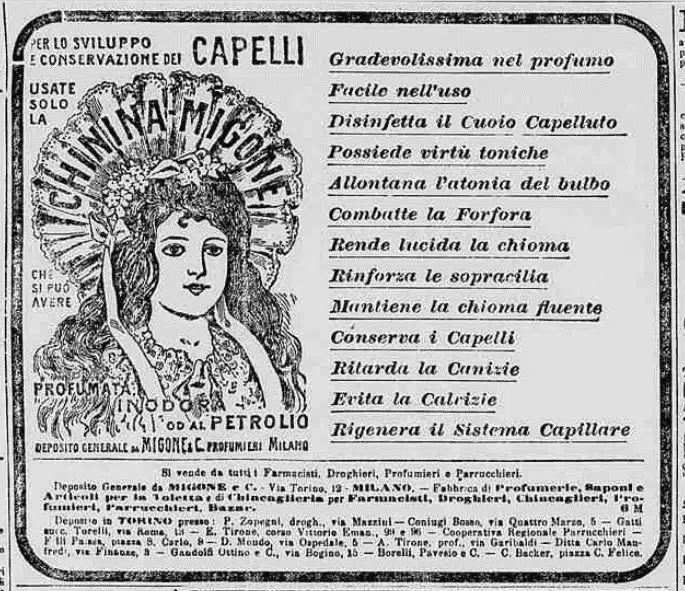 Il petrolio, peraltro, non era solo l’ “ingrediente” di molti di questi prodotti, ma anche una sorta di moderna fragranza; ne è un esempio la “Chinina Mignone”, un ritrovato “per lo sviluppo e conservazione dei capelli” disponibile in tre versioni: “Profumata, inodora od al petrolio”. Era prodotta, dice una pubblicità del 1904, a Milano dalla “Fabbrica di Profumerie, Saponi e Articoli per la Toeletta e di Chincaglieria per Farmacisti, Droghieri, Chincaglieri, Profumieri, Parrucchieri, Bazar”. Insomma, tutti quei negozi che, a inizio secolo, vendevano prodotti petroliferi.